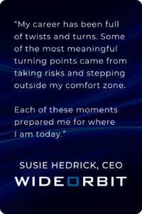 Through this CEO feature series, we are excited to introduce some of the outstanding leaders within the Lumine ecosystem, such as Susie Hedrick, CEO of WideOrbit. WideOrbit is a technology platform that creates media transaction value for TV and radio broadcasters, national TV networks, digital publishers, and advertisers. We sat down with Susie to learn more about her role as CEO and the journey that got her there.