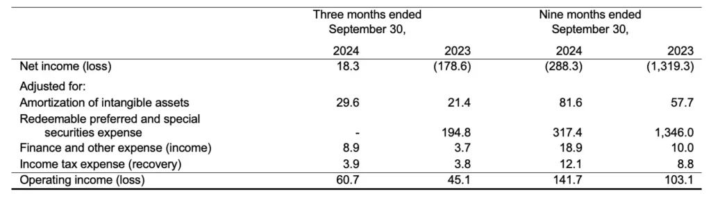 Operating income (loss) refers to income (loss) before income taxes, amortization of intangible assets, redeemable Preferred and Special Share expense, and finance and other expenses (income). We believe that operating income is useful supplemental information as it provides an indication of the profitability of the Company related to its core operations. Operating income (loss) is not a recognized measure under IFRS and may not be comparable to similar financial measures disclosed by other issuers. Accordingly, readers are cautioned that operating income (loss) should not be construed as an alternative to net income (loss).