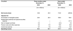 Net income for the three months ended December 31, 2025 was $49.6 million, an increase of 69%, or $20.2 million, compared to net income of $29.4 million for the same period in 2024. Net income for the year ended December 31, 2025 was $118.8 million compared to net loss of $258.9 million for the same period in 2024. The increase in net income for the three month period was attributable to improved profitability in our existing businesses, as well as contributions from recent acquisitions following strengthening activities. The increase in net income for the year ended is primarily attributable to the mandatory conversion of preferred and special securities on March 25, 2024 such that no further preferred and special securities expense was booked in the current year.