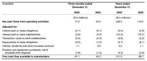 For the three months ended December 31, 2025, FCFA2S increased $21.8 million to $67.1 million compared to $45.3 million for the same period in 2024 representing an increase of 48%. The increase in the three months ended December 31, 2025 is driven by higher CFO compared to the same periods in 2024 and lower interest paid on bank indebtedness. For the year ended December 31, 2025, FCFA2S increased $131.3 million to $217.0 million compared to $85.7 million for the same period in 2024 representing an increase of 153%. The increase in the year ended December 31, 2025 is driven by higher CFO compared to the same period in 2024, higher interest received on bank deposits, and lower interest paid on bank indebtedness. FCFA2S is a non-IFRS Measure. See “Non-IFRS Measures”.