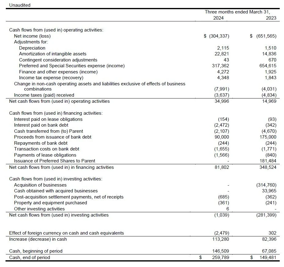 Operating income for the three months ended March 31, 2024 was $44.5 million, an increase of 105%, or $22.8 million, compared to $21.7 million for the same period in 2023. The increase for the three month period is primarily attributable to growth from acquisitions. Operating income is not a standardized financial measure and might not be comparable to measures disclosed by other issuers. See “Non-IFRS Measures”.