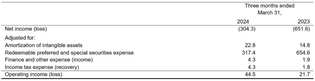 Operating income (loss) refers to income (loss) before income taxes, amortization of intangible assets, redeemable Preferred and Special Share expense, and finance and other expenses (income). We believe that operating income is useful supplemental information as it provides an indication of the profitability of the Company related to its core operations. Operating income (loss) is not a recognized measure under IFRS and may not be comparable to similar financial measures disclosed by other issuers. Accordingly, readers are cautioned that operating income (loss) should not be construed as an alternative to net income (loss).